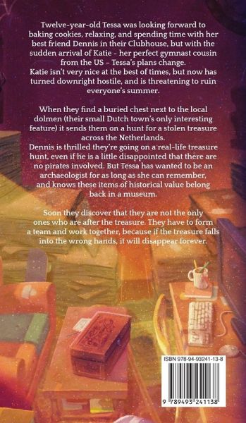 Twelve-year-old Tessa was looking forward to baking cookies, relaxing, and spending time with her best friend Dennis in their Clubhouse, but with the sudden arrival of Katie - her perfect gymnast cousin from the US - Tessa's plans change. Katie isn't very nice at the best of times, but now has turned downright hostile, and is threatening to ruin everyone's summer. When they find a buried chest next to the local dolmen (their small Dutch town's only interesting feature) it sends them on a hunt for a stolen treasure across the Netherlands. Dennis is thrilled they're going on a real-life treasure hunt, even if he is a little disappointed that there are no pirates involved. But Tessa has wanted to be an archaeologist for as long as she can remember, and knows these items of historical value belong back in a museum. Soon they discover that they are not the only ones who are after the treasure. They have to form a team and work together, because if the treasure falls into the wrong hands, it will disappear forever.