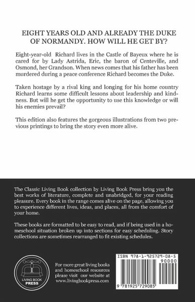 Eight-year-old Richard lives in the Castle of Bayeux where he is cared for by Lady Astrida, Eric, the baron of Centeville, and Osmond, her Grandson. When news comes that his father has been murdered during a peace conference Richard become the Duke. Taken hostage by a rival king and longing for his home country Richard learns some difficult lessons about leadership and kindness. But will he get the opportunity to use this knowledge or will his enemies prevail? This edition also features the gorgeous illustrations from two previous This edition features the gorgeous illustrations from two previous printings to bring the story even more alive, and has been split into 24 easy to read sections for easy scheduling when using a Charlotte Mason education.