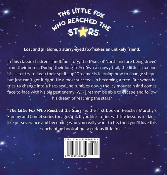 "I recommend this book for its unique blend of imaginative storytelling and valuable life lessons, making it a perfect choice for both engaging read-alouds in school and quiet reflections at home."Jennifer Senick for Readers' Favorite Lost and all alone, a starry-eyed fox makes an unlikely friend. In this classic children's bedtime story, the foxes of Northland are being driven from their home. During their long trek down a snowy trail, the littlest fox and his sister try to keep their spirits up. Dreamer is learning how to change shape, but just can't get it right. He almost succeeds in becoming a tree. But when he tries to change into a harp seal, he tumbles down the icy mountain and comes face-to-face with his biggest enemy. Will Dreamer be able to escape and follow his dream of reaching the stars? "The Little Fox Who Reached the Stars" is the first book in Peaches Murphy's Sammy and Comet series for ages 4-8. If you like stories with life lessons for kids, like perseverance and becoming who you really want to be, then you'll love this enchanting book about a curious little fox.