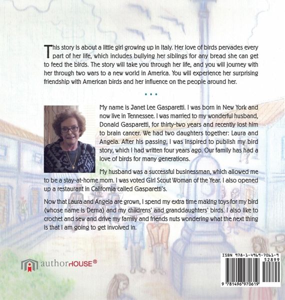 This story is about a little girl growing up in Italy. Her love of birds pervades every part of her life, which includes bullying her siblings for any bread she can get to feed the birds. The story will take you through her life, and you will journey with her through two wars to a new world in America. You will experience her surprising friendship with American birds and her influence on the people around her.