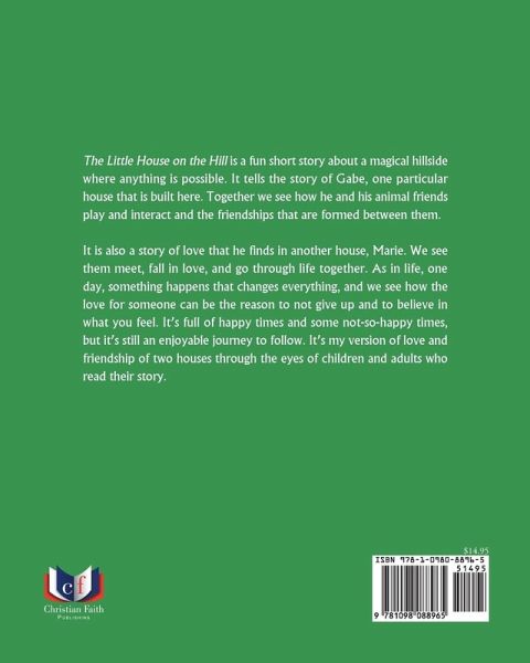 The Little House on the Hill is a fun short story about a magical hillside where anything is possible. It tells the story of Gabe, one particular house that is built here. Together we see how he and his animal friends play and interact and the friendships that are formed between them. It is also a story of love that he finds in another house, Marie. We see them meet, fall in love, and go through life together. As in life, one day, something happens that changes everything, and we see how the love for someone can be the reason to not give up and to believe in what you feel. It's full of happy times and some not-so-happy times, but it's still an enjoyable journey to follow. It's my version of love and friendship of two houses through the eyes of children and adults who read their story.