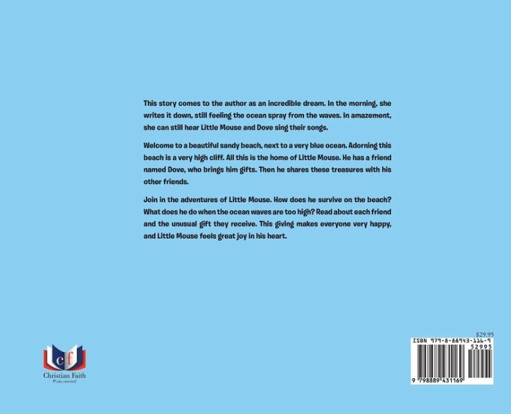 This story comes to the author as an incredible dream. In the morning, she writes it down, still feeling the ocean spray from the waves. In amazement, she can still hear Little Mouse and Dove sing their songs. Welcome to a beautiful sandy beach, next to a very blue ocean. Adorning this beach is a very high cliff. All this is the home of Little Mouse. He has a friend named Dove, who brings him gifts. Then he shares these treasures with his other friends. Join in the adventures of Little Mouse. How does he survive on the beach? What does he do when the ocean waves are too high? Read about each friend and the unusual gift they receive. This giving makes everyone very happy, and Little Mouse feels great joy in his heart.
