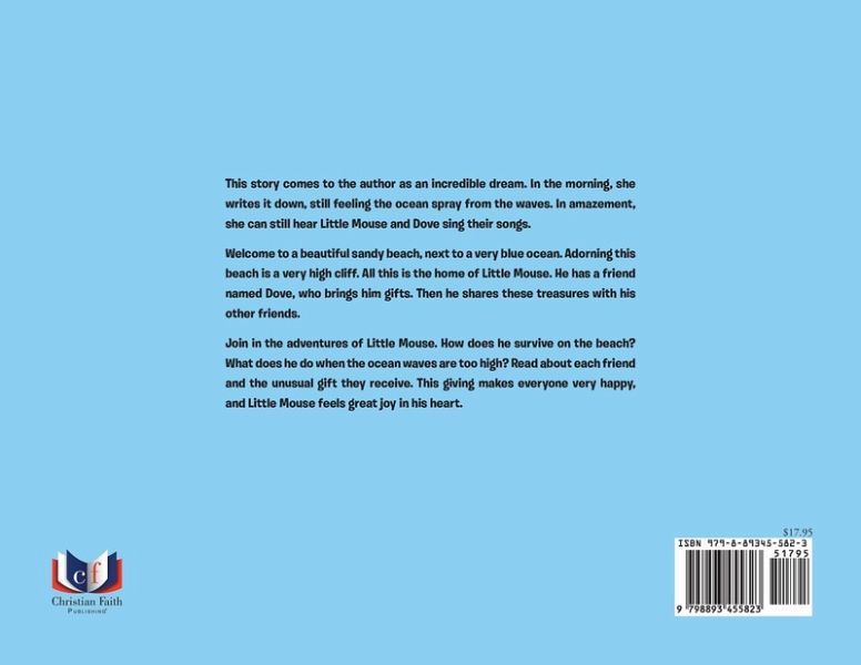 This story comes to the author as an incredible dream. In the morning, she writes it down, still feeling the ocean spray from the waves. In amazement, she can still hear Little Mouse and Dove sing their songs. Welcome to a beautiful sandy beach, next to a very blue ocean. Adorning this beach is a very high cliff. All this is the home of Little Mouse. He has a friend named Dove, who brings him gifts. Then he shares these treasures with his other friends. Join in the adventures of Little Mouse. How does he survive on the beach? What does he do when the ocean waves are too high? Read about each friend and the unusual gift they receive. This giving makes everyone very happy, and Little Mouse feels great joy in his heart.