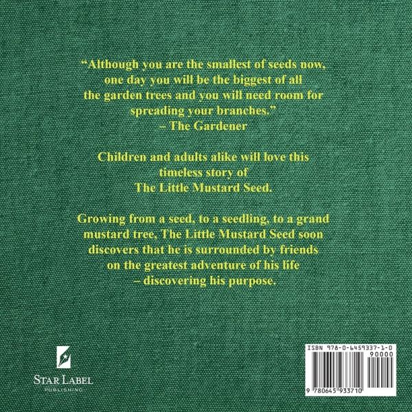 "Although you are the smallest of seeds now, one day you will be the biggest of all the garden trees and you will need room for spreading your branches." -The Gardener Children and adults alike will love this timeless story of The Little Mustard Seed. Growing from a seed, to a seedling, to a grand mustard tree, The Little Mustard Seed soon discovers that he is surrounded by friends on the greatest adventure of his life - discovering his purpose.