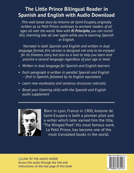 The Little Prince (El Principito) in Spanish and English for Children and Readers of All Ages Revisit the charming tale of The Little Prince, a well-loved story by Antoine de Saint-Exupéry. Fall in love with the story all over again while you improve your Spanish or English language skills. Perfect for All Readers---Both Young and Old Introduce the love of stories to the next generation of readers by sharing this timeless tale with young readers. The Little Prince (El Principito) is perfect for sharing with the entire family: children will adore the lovely fairy tale that the story is wrapped in while older readers would appreciate it for what it truly is---rife with thought-provoking allegories and metaphors that will change the way you look at life. Written in Parallel Text to Boost Comprehension Each paragraph is written in both Spanish and English---first in Spanish, followed by its English equivalent. You can also read the stories in Spanish only or in English only: perfect for bilingual children whether native Spanish or English speakers! The story is recorded in two ways---an English version narrated by a native English speaker, and a Spanish version narrated by a native Spanish speaker. The audio is designed as a perfect supplement to help you learn the proper Spanish and English pronunciation and improve your listening skills while you're enjoying the story. Grab your copy today and be bilingual in Spanish and English!