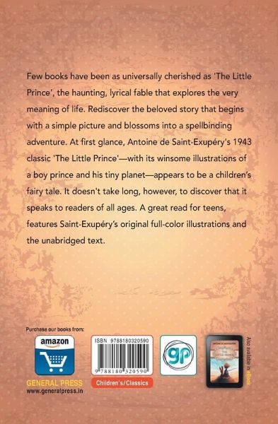 Few books have been as universally cherished as 'The Little Prince', the haunting, lyrical fable that explores the very meaning of life. Rediscover the beloved story that begins with a simple picture and blossoms into a spellbinding adventure. At first glance, Antoine de Saint-Exupéry's 1943 classic 'The Little Prince'-with its winsome illustrations of a boy prince and his tiny planet-appears to be a children's fairy tale. It doesn't take long, however, to discover that it speaks to readers of all ages. A great read for teens, features Saint-Exupéry's original full-color illustrations and the unabridged text. About the Author: Antoine de Saint-Exupéry, officially Antoine Marie Jean-Baptiste Roger, comte de Saint Exupéry, was a French aristocrat, writer, poet, and pioneering aviator during a period when flying machines were made of sticks and fabric. He became a laureate of several of France's highest literary awards and also won the U.S. National Book Award. He is best remembered for his novella The Little Prince and for his lyrical aviation writings, including Wind, Sand and Stars and Night Flight. Saint-Exupéry was a successful commercial pilot before World War II, working airmail routes in Europe, Africa and South America. At the outbreak of war, he joined the French Air Force, flying reconnaissance missions until France's armistice with Germany in 1940. After being demobilised from the French Air Force, he travelled to the United States to persuade its government to enter the war against Nazi Germany. Following a 27-month hiatus in North America, during which he wrote three of his most important works, he joined the Free French Air Force in North Africa, although he was far past the maximum age for such pilots and in declining health.