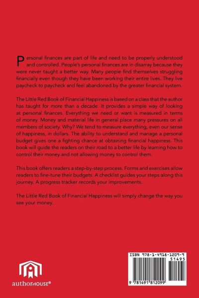 Personal finances are part of life and need to be properly understood and controlled. People's personal finances are in disarray because they were never taught a better way. Many people find themselves struggling financially even though they have been working their entire lives. They live paycheck to paycheck and feel abandoned by the greater financial system. The Little Red Book of Financial Happiness is based on a class that the author has taught for more than a decade. It provides a simple way of looking at personal finances. Everything we need or want is measured in terms of money. Money and material life in general place many pressures on all members of society. Why? We tend to measure everything, even our sense of happiness, in dollars. The ability to understand and manage a personal budget gives one a fighting chance at obtaining financial happiness. This book will guide the readers on their road to a better life by learning how to control their money and not allowing money to control them. This book offers readers a step-by-step process. Forms and exercises allow readers to fine-tune their budgets. A checklist guides your steps along this journey. A progress tracker records your improvements. The Little Red Book of Financial Happiness will simply change the way you see your money.