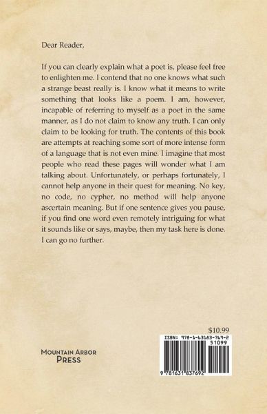 Dear Reader, If you can clearly explain what a poet is, please feel free to enlighten me. I contend that no one knows what such a strange beast really is. I know what it means to write something that looks like a poem. I am, however, incapable of referring to myself as a poet in the same manner, as I do not claim to know any truth. I can only claim to be looking for truth. The contents of this book are attempts at reaching some sort of more intense form of a language that is not even mine. I imagine that most people who read these pages will wonder what I am talking about. Unfortunately, or perhaps fortunately, I cannot help anyone in their quest for meaning. No key, no code, no cypher, no method will help anyone ascertain meaning. But if one sentence gives you pause, if you find one word even remotely intriguing for what it sounds like or says, maybe, then my task here is done. I can go no further.