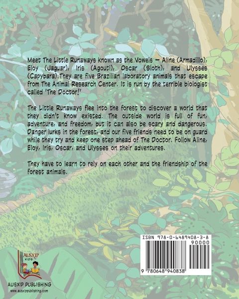 Meet The Little Runaways known as the Vowels - Aline (Armadillo), Eloy (Jaguar), Iris (Agouti), Oscar (Sloth), and Ulysses (Capybara). They are five Brazilian laboratory animals that decide to escape from The Animal Research Center deep in the Brazilian forest. The Animal Research Center is run by the terrible biologist called 'The Doctor!" The Little Runaways decide to escape the Center and flee into the forest to discover a world that they didn't know existed. The outside world is full of fun, adventure, and freedom, but it can also be scary and dangerous. Danger lurks in the forest, and our five friends need to be on guard while they try and keep one step ahead of The Doctor. Along the way they meet animals that they have never seen before. This is a new world for them and they unprepared for what will happen. Follow Aline, Eloy, Iris, Oscar, and Ulysses on their adventures. They have to learn to rely on each other and the friendship of the forest animals in order to survive and thrive in their new home.