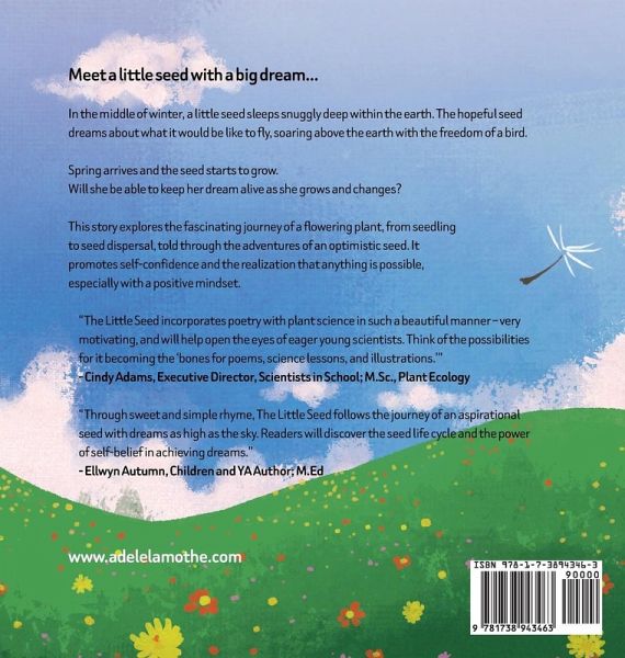 Meet a little seed with a big dream... In the middle of winter, a little seed sleeps snuggly deep within the earth. The hopeful seed dreams about what it would be like to fly, soaring above the earth with the freedom of a bird. Spring arrives and the seed starts to grow. Will she be able to keep her dream alive as she grows and changes? Help your child discover that every dream starts as a tiny seed This story explores the fascinating journey of a flowering plant, from seedling to seed dispersal, told through the adventures of an optimistic seed. It also promotes self-confidence and the realization that anything is possible, especially with a positive mindset. Reviews for The Little Seed: "The Little Seed incorporates poetry with plant science in such a beautiful manner - very motivating, and will help open the eyes of eager young scientists. Weaves enchantment with science and will help open the door to lasting interest in the natural world. Think of the possibilities for it becoming the 'bones for poems, science lessons, and illustrations.'" Cindy Adams, Executive Director, Scientists in School; M.Sc., Plant Ecology Adele Lamothe has introduced us to our new favorite friend. Thanks to her spirited raindrops named Splish and Splash, they watered the ground allowing The Little Seed to bloom. Through sweet and simple rhyme, The Little Seed follows the journey of an aspirational seed with dreams as high as the sky. Readers will discover the seed life cycle and the power of self-belief in achieving dreams. Ellwyn Autumn, Children & YA Author; M.Ed. An educational story that introduces the plant life cycle in a creative way A book that inspires children to believe in their dreams A STEM book perfect for schools and libraries