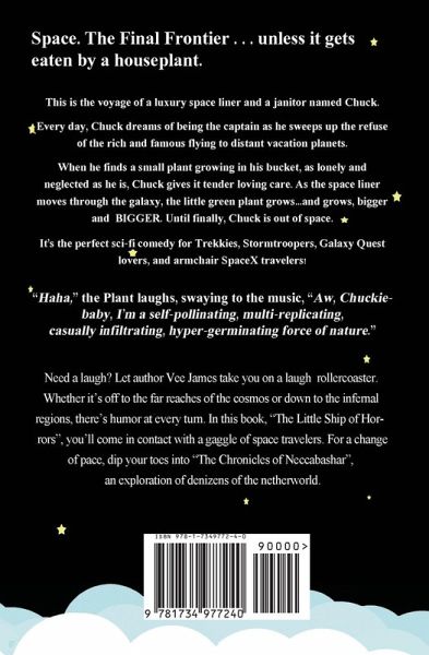 Space. The Final Frontier . . .unless it gets eaten by a houseplant. This is the voyage of a luxury space liner and a janitor named Chuck. Every day, Chuck dreams of being the captain as he sweeps up the refuse of the rich and famous flying to distant vacation planets. When he finds a small plant growing in his bucket, as lonely and neglected as he is, Chuck gives it tender loving care. As the space liner moves through the galaxy, the little green plant grows...and grows, bigger and BIGGER. Until finally, Chuck is out of space. It's the perfect sci-fi comedy for Trekkies, Stormtroopers, Galaxy Quest lovers, and armchair SpaceX travelers!