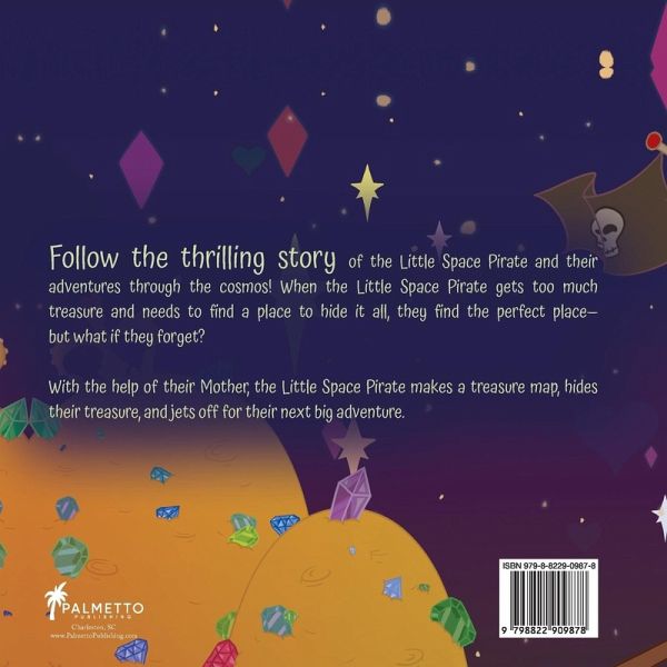 There once was a little Space Pirate who flew through the sea of stars on their special Space Pirate ship... Follow the thrilling story of the Little Space Pirate and their adventures through the cosmos! Join them on their journey through the stars as they pick up treasure as bright and shiny as a thousand suns along the way. One day, the Little Space Pirate gets too much treasure and needs to find a place to hide it all. What if they forgot where their secret place is, and don't know where to hide the treasure? It's time to make a treasure map! With the help of their Mother, the Little Space Pirate makes a treasure map, hides their treasure, and jets off for their next big adventure. This picture book features a non-binary main character and is a perfect adventure book for 3- to 6-year-olds.