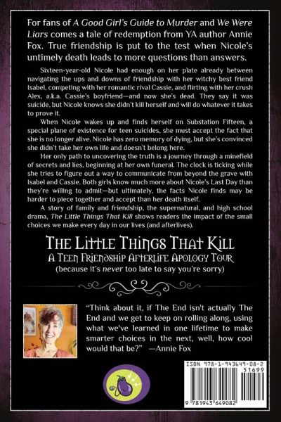Kirkus Reviews' Best Books of 2025 "YES, must read!"She thought dying would be the end. Turns out, it's just the beginning. Sixteen-year-old Nicole Benson wakes up on a floating platform surrounded by dead kids... only she doesn't remember dying. Everyone insists she killed herself, but Nicole knows that's not true. Now trapped in Substation Fifteen-the special afterlife realm for teens who ended their own lives-she's got just thirty days to uncover the facts and piece together what happened. If she fails, her next stop could be really be the end. But the truth is a tangled mess of secrets, lies, and betrayals. If Nicole's not strong enough, the facts she finds might be harder to accept than death itself. For fans of Before I Fall, We Were Liars, and A Good Girl's Guide to Murder comes a haunting and heartfelt YA paranormal mystery about friendship, forgiveness, and the destructive lies we tell ourselves-even after death. SYNOPSIS:True friendship is put to the test when Nicole's untimely death leads to more questions than answers. Sixteen-year-old Nicole already had enough on her plate between distancing herself from her embarrassingly witchy bestie Isabel and competing with her don't-mess-with-me romantic rival Cassie, who happens to be dating Nicole's crush. Now Nicole is dead. This comes as a shock when she wakes up and finds herself on Substation Fifteen, an afterlife realm. They say it was suicide. Nicole has zero memory of dying, but she's convinced she didn't take her own life and doesn't belong there. Her only path to uncovering the truth is a fact-finding trip through a minefield of secrets and lies, beginning at her own funeral. But how can she communicate from beyond the grave with the two girls who know much more about Nicole's Last Day than they're willing to admit? Nicole better learn quickly because she has just thirty days to learn what really happened, otherwise she won't be moving on to her next destination. Ultimately, the facts Nicole finds may be harder to piece together and accept than death itself. A story of family, friendship, loss, and redemption, The Little Things That Kill exposes the impact of the small choices we make every day in our lives (and afterlives).