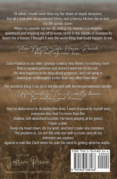 I'll admit, I made more than my fair share of stupid decisions, but all it took was an accidental felony and a teensy kitchen fire to turn my life upside down. When my parents cut me off, selling my swanky Los Angeles apartment and shipping me off to some ranch in the middle of nowhere to teach me a lesson, I thought it was the worst thing that could happen to me. Then I got to Safe Haven Ranch and met my new boss. Zach Paulson is an older, grumpy cowboy who thinks I'm nothing more than a spoiled princess and doesn't want me on his turf. He also happens to be drop-dead gorgeous, and can wear a faded pair of Wranglers better than any other man alive. The dumbest thing I can do is fall into lust with the temperamental rancher. Unfortunately, I'm not exactly known for making good choices. But I'm determined to do better this time. I want to prove to myself and everyone else that I'm more than the shallow, self-absorbed socialite I've been playing at for years. I have a plan. Keep my head down, do my work, and don't make any mistakes. The problem is, I'm not the only one with a crush, and all my defenses are useless against a man like Zach when he puts his mind to getting what he wants.