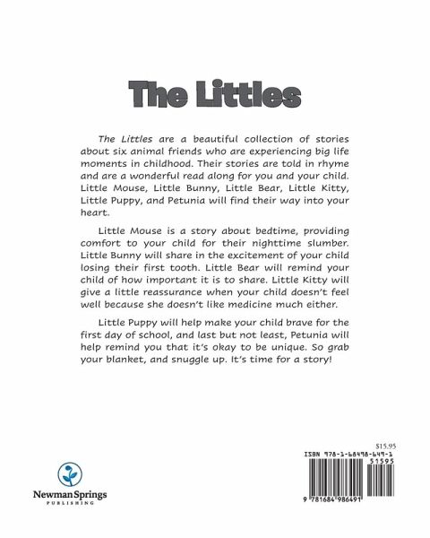 The Littles are a beautiful collection of stories about six animal friends who are experiencing big life moments in childhood. Their stories are told in rhyme and are a wonderful read along for you and your child. Little Mouse, Little Bunny, Little Bear, Little Kitty, Little Puppy, and Petunia will find their way into your heart. Little Mouse is a story about bedtime, providing comfort to your child for their nighttime slumber. Little Bunny will share in the excitement of your child losing their first tooth. Little Bear will remind your child of how important it is to share. Little Kitty will give a little reassurance when your child doesn't feel well because she doesn't like medicine much either. Little Puppy will help make your child brave for the first day of school, and last but not least, Petunia will help remind you that it's okay to be unique. So grab your blanket, and snuggle up. It's time for a story!