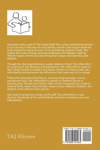 Welcome to the world of The Littlest Bird! This curious and determined bird is on a journey to discover his true identity, and he's learning all about the birds around him along the way. In this enchanting children's book, The Littlest Bird soars through stunning landscapes and habitats, meeting different types of birds and uncovering their unique characteristics and abilities. Through this charming adventure, young readers will join The Littlest Bird on a journey of self-discovery and exploration. The Littlest Bird's quest to learn about himself and others will inspire children to embrace their own individuality and appreciate the differences that make each of us unique. Filled with captivating illustrations, heartwarming messages, and an educational twist, The Littlest Bird is perfect for bedtime stories or learning time. Parents and children alike will be transported to a magical world of birds, where they will learn about various habitats, lifestyles, and abilities of the different bird species. Get ready to spread your wings and fly with The Littlest Bird, as you discover the beauty of the world of birds and learn to embrace your own individuality!