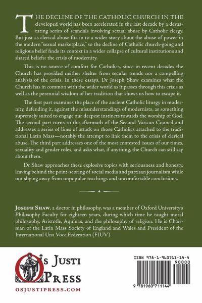 The decline of the Catholic Church in the developed world has been accelerated in the last decade by a devastating series of scandals involving sexual abuse by Catholic clergy. But just as clerical abuse fits in to a wider story about the abuse of power in the modern "sexual marketplace," so the decline of Catholic church-going and religious belief finds its context in a wider collapse of cultural institutions and shared beliefs: the crisis of modernity. This is no source of comfort for Catholics, since in recent decades the Church has provided neither shelter from secular trends nor a compelling analysis of the crisis. In these essays, Dr Joseph Shaw examines what the Church has in common with the wider world as it passes through this crisis as well as the perennial wisdom of her tradition that shows us how to escape it. The first part examines the place of the ancient Catholic liturgy in modernity, defending it, against the misunderstandings of modernists, as something supremely suited to engage our deepest instincts towards the worship of God. The second part turns to the aftermath of the Second Vatican Council and addresses a series of lines of attack on those Catholics attached to the traditional Latin Mass-notably the attempt to link them to the crisis of clerical abuse. The third part addresses one of the most contested issues of our times, sexuality and gender roles, and asks what, if anything, the Church can still say about them. Dr Shaw approaches these explosive topics with seriousness and honesty, leaving behind the point-scoring of social media and partisan journalism while not shying away from unpopular teachings and uncomfortable conclusions.