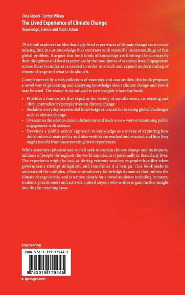 This book explores the idea that daily lived experiences of climate change are a crucial missing link in our knowledge that contrasts with scientific understandings of this global problem. It argues that both kinds of knowledge are limiting: the sciences by their disciplines and lived experiences by the boundaries of everyday lives. Therefore each group needs to engage the other in order to enrich and expand understanding of climate change and what to do about it.