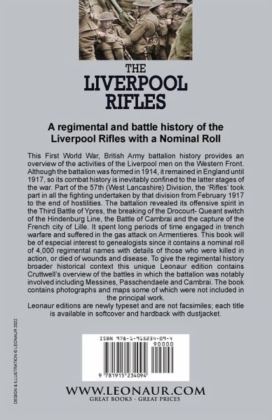 A regimental and battle history of the Liverpool Rifles with a Nominal Roll This First World War, British Army battalion history provides an overview of the activities of the Liverpool men on the Western Front. Although the battalion was formed in 1914, it remained in England until 1917, so its combat history is inevitably confined to the latter stages of the war. Part of the 57th (West Lancashire) Division, the 'Rifles' took part in all the fighting undertaken by that division from February 1917 to the end of hostilities. The battalion revealed its offensive spirit in the Third Battle of Ypres, the breaking of the Drocourt- Queant switch of the Hindenburg Line, the Battle of Cambrai and the capture of the French city of Lille. It spent long periods of time engaged in trench warfare and suffered in the gas attack on Armentieres. This book will be of especial interest to genealogists since it contains a nominal roll of 4,000 regimental names with details of those who were killed in action, or died of wounds and disease. To give the regimental history broader historical context this unique Leonaur edition contains Cruttwell's overview of the battles in which the battalion was notably involved including Messines, Passchendaele and Cambrai. The book contains photographs and maps some of which were not included in the principal work. Leonaur editions are newly typeset and are not facsimiles; each title is available in softcover and hardback with dustjacket.