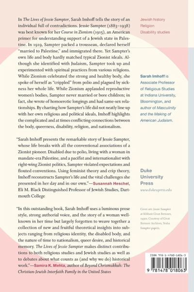 In The Lives of Jessie Sampter, Sarah Imhoff tells the story of an individual full of contradictions. Jessie Sampter (1883-1938) was best known for her Course in Zionism (1915), an American primer for understanding support of a Jewish state in Palestine. In 1919, Sampter packed a trousseau, declared herself "married to Palestine," and immigrated there. Yet Sampter's own life and body hardly matched typical Zionist ideals. Although she identified with Judaism, Sampter took up and experimented with spiritual practices from various religions. While Zionism celebrated the strong and healthy body, she spoke of herself as "crippled" from polio and plagued by sickness her whole life. While Zionism applauded reproductive women's bodies, Sampter never married or bore children; in fact, she wrote of homoerotic longings and had same-sex relationships. By charting how Sampter's life did not neatly line up with her own religious and political ideals, Imhoff highlights the complicated and at times conflicting connections between the body, queerness, disability, religion, and nationalism.