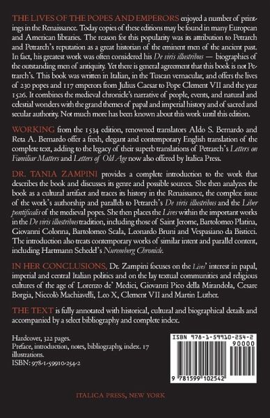 "The Lives of the Popes and Emperors" enjoyed a number of printings in the early Renaissance: Florence, 1478; Venice, 1507, 1526 and 1534. Today copies of these editions may be found in at least eight American libraries: New York Public, University of Miami, Chicago, Cornell, Indiana, Princeton, Washington (Seattle) and Yale. The obvious reason for this popularity was its attribution to Petrarch and Petrarch's reputation as a great historian of the eminent men of the ancient past. In fact, his greatest work was often considered his "De viris illustribus" - Latin biographies of the outstanding classical men of action. Yet there is general agreement that this book is not Petrarch's. This book was written in Italian, in the Tuscan vernacular, and offers the lives of 230 popes and 117 emperors from Julius Caesar to Pope Clement VII and the year 1526. It combines the medieval chronicle's narrative of people, events, natural and celestial wonders with the grand themes of papal and imperial history and of sacred and secular authority. Not much more has been known about this work until the present edition. Working from the 1534 edition, renowned translators Aldo S. Bernardo and Reta A. Bernardo offer a fresh, elegant and contemporary English translation of the complete text, adding to the legacy of their superb translations of Petrarch's "Letters on Familiar Matters" and "Letters of Old Age" now also offered by Italica Press. Dr. Tania Zampini provides a complete introduction to the work that describes the book and discusses its genre and possible sources. She then analyzes the book as a cultural artifact and traces its history in the Renaissance, the complex issue of the work's authorship and parallels to Petrarch's "De viris illustribus" and the "Liber pontificalis" of the medieval popes. She then places the Lives within the important works in the "De viris illustribus" tradition, including those of Saint Jerome, Bartolomeo Platina, Giovanni Colonna, Bartolomeo Scala, Leonardo Bruni and Vespasiano da Bisticci. The introduction also treats contemporary works of similar intent and parallel content, including Hartmann Schedel's "Nuremberg Chronicle." In her conclusions, Dr. Zampini places the Lives into the larger context of Renaissance society and culture, focusing on the work's major themes and its interest in papal, imperial and central Italian politics as well as on the newly emerging lay textual communities and religious cultures of the age of Lorenzo de' Medici, Giovanni Pico della Mirandola, Cesare Borgia, Niccolò Machiavelli, Leo X, Clement VII and Martin Luther. The text is fully annotated with historical, cultural and biographical details and accompanied by the introduction, a select bibliography, seventeen illustrations and a complete index. 322 pages. History, cultural studies, Mediterranean studies, humanism.