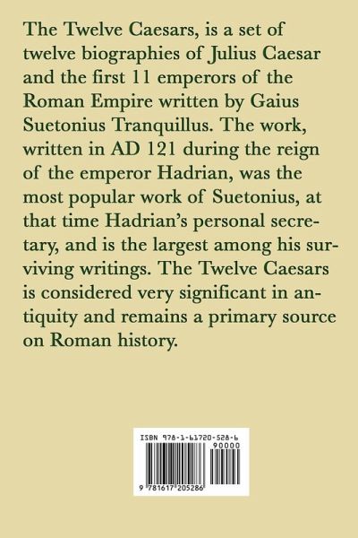 The Twelve Caesars, is a set of twelve biographies of Julius Caesar and the first 11 emperors of the Roman Empire written by Gaius Suetonius Tranquillus. The work, written in AD 121 during the reign of the emperor Hadrian, was the most popular work of Suetonius, at that time Hadrian's personal secretary, and is the largest among his surviving writings. The Twelve Caesars is considered very significant in antiquity and remains a primary source on Roman history.