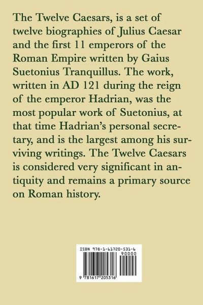 The Twelve Caesars, is a set of twelve biographies of Julius Caesar and the first 11 emperors of the Roman Empire written by Gaius Suetonius Tranquillus. The work, written in AD 121 during the reign of the emperor Hadrian, was the most popular work of Suetonius, at that time Hadrian's personal secretary, and is the largest among his surviving writings. The Twelve Caesars is considered very significant in antiquity and remains a primary source on Roman history.