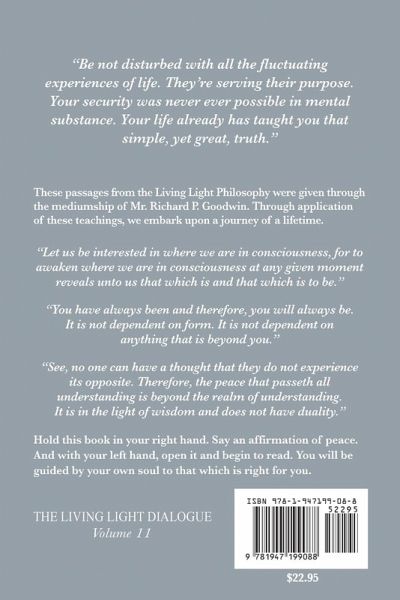 This book is a series of spiritual awareness classes that were given through the spiritual mediumship of Mr. Richard P. Goodwin, the founder of the Serenity Association, and are part of the Living Light Philosophy. The classes cover a wide range of topics, including, but not limited to, the relationship between our attitudes and our experiences, personal responsibility, divine laws that govern life, mental laws, the nature of thought, and how the mind works. There are 33 complete classes in this volume. While each class appears to bring progressively higher teachings, each, nevertheless, stands by itself and is attuned to both the beginning as well as the advanced student. This series of classes, the CQAs, were delivered to the congregation of the Serenity Spiritualist Church as part of its devotional services. This book is the eleventh volume in the series entitled The Living Light Dialogue, and many more are to be published. The Living Light Philosophy consists of the spiritual awareness classes, lectures, and discourses that were given through the spiritual mediumship of Mr. Goodwin and is one of personal responsibility and awareness. Any student of life will find in this philosophy, through the published books and audio recordings, the teachings necessary for the mind's awakening to the truth of the soul's eternal expression. The teaching in and of itself is a continuous flow. The Teacher, expressing through the mediumship of Mr. Goodwin, speaks of the neutrality of God, evolutionary incarnation, soul faculties and sense functions and their corresponding locations in the anatomy, the power of peace, the law that whatever happens to us is caused by us, and many other personally demonstrable laws which will constantly expand the student's awareness. These teachings are invaluable as tools to further your knowledge of the universal laws of life. The methods, discourses, and exercises given are useful, practical, and pertinent to your everyday living as well as to your higher aspirations. This spiritual philosophy affirms that our soul, our true being, is inseparably a part of the Divine and reveals the spiritual laws and the divine laws that govern all life and how we may apply those laws for our greater health, wealth, and happiness. The very foundation of these spiritual teachings is the Law of Personal Responsibility, which states in part that we are responsible for all our experiences. By the laws that we establish with our thoughts, acts, and words, we are the creators of all our experiences in life. Our experiences in life are reflecting back to us where we are in consciousness. In this understanding, God is not a creator, but God is a divine, neutral, infinite intelligent energy that sustains all life. Another divine law that is emphasized is that like attracts like and becomes the Law of Attachment. In addition, great emphasis is placed on understanding how our minds work, and how we may, through self-control, more effectively use our minds to experience the goodness of life. The philosophy helps us to discern between the thoughts of our mind and the gentle promptings of our soul. These spiritual teachings are filled with inspirational quotes, affirmations, spiritual sayings, and spiritual exercises. The Living Light Philosophy offers a path to a conscious awareness of our own divinity, but it is up to us to make the effort to walk that path.