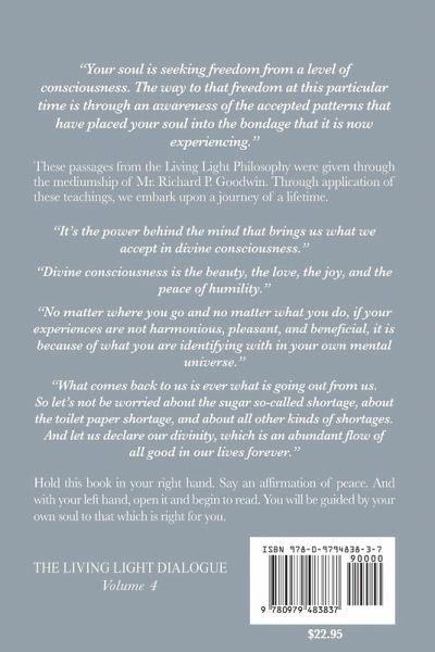 This book is a series of spiritual awareness classes that were given through the spiritual mediumship of Mr. Richard P. Goodwin, the founder of the Serenity Association, and are part of the Living Light Philosophy. The classes cover a wide range of topics, including the relationship between our attitudes and our experiences, personal responsibility, divine laws that govern life, mental laws, the nature of thought, and how the mind works, to name a few. There are 24 complete classes of the philosophy. While each class appears to bring progressively higher teachings, each, nevertheless, stands by itself and is attuned to both the beginning as well as the advanced student. This series of classes were given to a group of students of the philosophy. This book is the fourth volume in the series entitled The Living Light Dialogue, and many more are to be published. The Living Light Philosophy consists of the spiritual awareness classes, lectures, and discourses that were given through the spiritual mediumship of Mr. Goodwin and is one of personal responsibility and awareness. Any student of life will find in this philosophy, through the published books and audio recordings, the teachings necessary for the mind's awakening to the truth of the soul's eternal expression. The teaching in and of itself is a continuous flow. The Teacher, expressing through the mediumship of Mr. Goodwin, speaks of the neutrality of God, evolutionary incarnation, soul faculties and sense functions and their corresponding locations in the anatomy, the power of peace, the law that whatever happens to us is caused by us, and many other personally demonstrable laws which will constantly expand the student's awareness. These teachings are invaluable as tools to further your knowledge of the universal laws of life. The methods, discourses, and exercises given are useful, practical, and pertinent to your everyday living as well as to your higher aspirations. This spiritual philosophy affirms that our soul, our true being, is inseparably a part of the Divine and reveals the spiritual laws and the divine laws that govern all life and how we may apply those laws for our greater health, wealth, and happiness. The very foundation of these spiritual teachings is the Law of Personal Responsibility, which states in part that we are responsible for all our experiences. By the laws that we establish with our thoughts, acts, and words, we are the creators of all our experiences in life. Our experiences in life are reflecting back to us where we are in consciousness. In this understanding, God is not a creator, but God is a divine, neutral, infinite intelligent energy that sustains all life. Another divine law that is emphasized is that like attracts like and becomes the Law of Attachment. In addition, great emphasis is place on understanding how our minds work, and how we may, through self-control, more effectively use our minds to accomplish our goals and experience the goodness of life. The philosophy helps us to discern between the thoughts of our mind and the gentle promptings of our soul. These spiritual teachings are filled with inspirational quotes, affirmations, spiritual sayings, and spiritual exercises. The Living Light Philosophy offers a path to a conscious awareness of our own divinity, but it is up to us to make the effort to walk that path.
