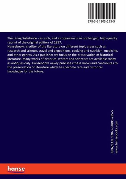 The Living Substance - as such, and as organism is an unchanged, high-quality reprint of the original edition of 1897.Hansebooks is editor of the literature on different topic areas such as research and science, travel and expeditions, cooking and nutrition, medicine, and other genres. As a publisher we focus on the preservation of historical literature. Many works of historical writers and scientists are available today as antiques only. Hansebooks newly publishes these books and contributes to the preservation of literature which has become rare and historical knowledge for the future.