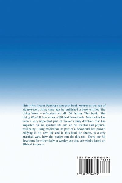 This is Rev Trevor Dearing's sixteenth book, written at the age of eighty-seven. He has been engaged in the ministry of evangelism for sixty years, peaching and healing and has been pastor of six churches in the UK and USA. Some time ago he published a book entitled 'The Living Word - reflections on all 150 Psalms. This book, 'The Living Word II' is a series of devotionals. Meditation has been a very important part of Trevor's daily devotion that has impacted on his spiritual life and on his mental and physical well-being. Using meditation as part of a devotional has proved edifying in his own life and in this book, he shares, in a very practical way, how the reader can do this too. Some have argued that meditation should be avoided by Christians and of course it is important to emphasise that it is a matter of what we meditate on that is important. Meditation is rooted in scripture; we can read about it in the Psalms and even in Genesis. In this book there are 54 devotions for either daily or weekly use. The introduction includes a brief example of how best to use the book and the best way to carry out these meditations that are wholly based on Biblical Scripture.
