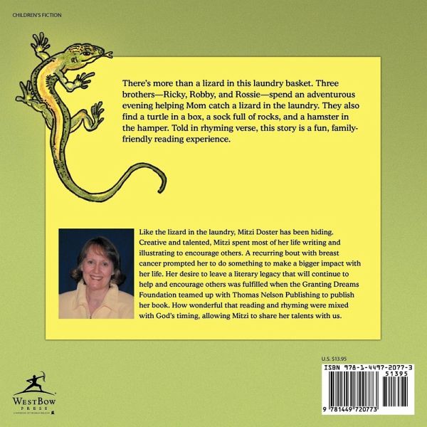 There's more than a lizard in this laundry basket. Three brothers-Ricky, Robby, and Rossie-spend an adventurous evening helping Mom catch a lizard in the laundry. They also find a turtle in a box, a sock full of rocks, and a hamster in the hamper. Told in rhyming verse, this story is a fun, family-friendly reading experience.
