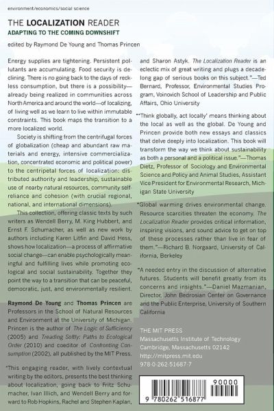 Readings that point the way to a peaceful, democratic, and ecologically resilient transition to an era of localization, limits, and societal opportunities. Energy supplies are tightening. Persistent pollutants are accumulating. Food security is declining. There is no going back to the days of reckless consumption, but there is a possibility—already being realized in communities across North America and around the world—of localizing, of living well as we learn to live well within immutable constraints. This book maps the transition to a more localized world. Society is shifting from the centrifugal forces of globalization (cheap and abundant raw materials and energy, intensive commercialization, concentrated economic and political power) to the centripetal forces of localization: distributed authority and leadership, sustainable use of nearby natural resources, community self-reliance and cohesion (with crucial regional, national, and international dimensions). This collection, offering classic texts by such writers as Wendell Berry, M. King Hubbert, and Ernst F. Schumacher, as well as new work by authors including Karen Litfin and David Hess, shows how localization—a process of affirmative social change—can enable psychologically meaningful and fulfilling lives while promoting ecological and social sustainability. Topics range from energy dynamics to philosophies of limits, from the governance of place-based communities to the discovery of positive personal engagement. Together they point the way to a transition that can be peaceful, democratic, just, and environmentally resilient.