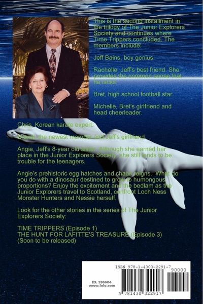 Second of the original trilogy describing the wonderful adventures about The Junior Explorers Society and continues where Time Trippers concluded. The members include: Jeff Bains, boy genius. Rachelle, Jeff's best friend. She provides the common sense that he lacks. Bret, high school football star. Michelle, Bret's girlfriend and head cheerleader. Chris, Korean karate expert. Angie, Jeff's 8-year old sister. Although she earned her place in the JES, she still tends to be trouble for the teenagers. Brandi, the newest member and Jeff's girlfriend. Angie's prehistoric egg hatches and chaos reigns. What do you do with a dinosaur destined to grow to humongous proportions? Enjoy the excitement and the bedlam as the Junior Explorers travel to Scotland, confront Loch Ness Monster Hunters and Nessie herself. Look for the other stories in the series of The Junior Explorers Society: TIME TRIPPERS (Vol. 1) THE HUNT FOR LAFITTE'S TREASURE (Vol.3) (Soon to be released)