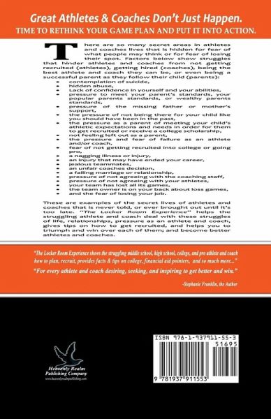 There are so many secret areas in athletes and coaches lives that is hidden for fear of what people may think or for fear of losing their spot. Factors below show struggles that hinder athletes and coaches from not getting recruited (athletes), getting hired (coaches), being the best athlete and coach they can be, or even being a successful parent as they follow their child (parents): ¿ contemplation of suicide, ¿ hidden abuse, ¿ Lack of confidence in yourself and your abilities, ¿ pressure to meet your parent's standards, your popular parents standards, or wealthy parents standards, ¿ pressure of the missing father or mother's support, ¿ the pressure of not being there for your child like you should have been in the past, ¿ the pressure as a parent of meeting your child's athletic expectations and needs in order for them to get recruited or receive a college scholarship, ¿ not feeling left out as a parent, ¿ the pressure and fear of failure as an athlete and/or coach, ¿ fear of not getting recruited into college or going pro, ¿ a nagging illness or injury, ¿ an injury that may have ended your career, ¿ jealous teammates, ¿ an unfair coaches decision, ¿ a failing marriage or relationship, ¿ pressure of not agreeing with the coaching staff, ¿ pressure of not agreeing with your athletes, ¿ your team has lost all its games, ¿ the team owner is on your back about loss games, ¿ and the fear of losing your job. These are examples of the secret lives of athletes and coaches that is never told, or ever brought out until it's too late. "The Locker Room Experience" helps the struggling athlete and coach deal with these struggles of life, relationships, pressure as an athlete and coach, gives tips on how to get recruited, and helps you to triumph and win over each of them; and become better athletes and coaches.
