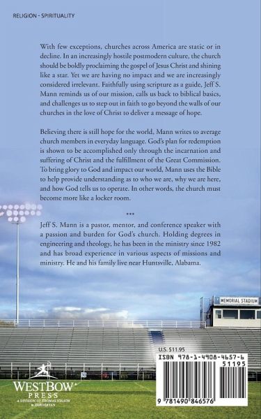 With few exceptions, churches across America are static or in decline. In an increasingly hostile postmodern culture, the church should be boldly proclaiming the gospel of Jesus Christ and shining like a star. Yet we are having no impact and we are increasingly considered irrelevant. Faithfully using scripture as a guide, Jeff S. Mann reminds us of our mission, calls us back to biblical basics, and challenges us to step out in faith to go beyond the walls of our churches in the love of Christ to deliver a message of hope. Believing there is still hope for the world, Mann writes to average church members in everyday language. God’s plan for redemption is shown to be accomplished only through the incarnation and suffering of Christ and the fulfillment of the Great Commission. To bring glory to God and impact our world, Mann uses the Bible to help provide understanding as to who we are, why we are here, and how God tells us to operate. In other words, the church must become more like a locker room.