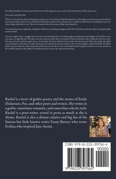 Reworked Omnibus of stories from Rachel Lawson's The Magicians series, such as this Dark Fantasy-Gothic short story; The Locket And The Thief What if you lost the last physical thing that reminds you of a lost beloved child through theft, and it happens to be found upon the body of the now dead thief, and it is now in the hands of the police would you if you had access to would you take it back? Is stealing back your own stolen thing, really theft or is it? This is the situation where this coroner, Blake, finds himself in. On a lonely quiet misty night after midnight in Melbourne, anything can happen and it did. At that hour, only the reckless and unprincipled wander around. On such a night as this, a straggler from a theatre was wandering in the cool calming night remembering a lost daughter who he'd lost many years ago on a night like this. This day, to be exact, 28 years earlier. She was murdered with her husband as they walked the street he was in. He came as he always did this night to lay a rose for them. He did so unbothered, for all the times he had come. Before that night. He pulled out an old locket and looked at it sadly and opened it, looking at the pictures inside it. They were his daughter and her husband. The father pulled a red rose from his inside coat pocket and lay the rose on the wet road. As the father knelt laying the rose there was a noise nearby on the road like a splash in the puddle, he looked up and saw a man with a gun trained on him.