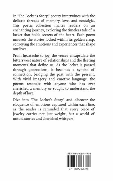In "The Locket's Story," poetry intertwines with the delicate threads of memory, love, and nostalgia. This poetic collection invites readers on an enchanting journey, exploring the timeless tale of a locket that holds secrets of the heart. Each poem unravels the stories locked within its golden clasp, conveying the emotions and experiences that shape our lives. From heartache to joy, the verses encapsulate the bittersweet nature of relationships and the fleeting moments that define us. As the locket is passed through generations, it becomes a symbol of connection, bridging the past with the present. With vivid imagery and emotive language, the poems resonate with anyone who has ever cherished a memory or sought to understand the depth of love. Dive into "The Locket's Story" and discover the eloquence of emotions captured within each line, as the reader is reminded that every piece of jewelry carries not just weight, but a world of untold stories and cherished whispers.