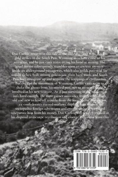 Doc Carlile returns in this tale of the old American west. Recent gold strikes in the South Pass, Wyoming area have come to his attention, and he just can't resist trying his hand at mining. The good doctor subsequently stumbles upon an ancient mystery inside an underground passageway, which also yeilds potential for untold riches. Still, mining gold is just plain hard work, and South Pass has yet togrow up and acquiire the trappings of civilization. But even in the mountains of Wyoming, Carlile can't seem to shake the ghosts from his storied past, not to mention those involved in his new venture. As if just surviving in the wilderness isn't hard enough. He must garner assistance from friends, both old and new to fend off trouble from the area Native Americans, ex-confederates-turned-outlaws, duplicittious women, a sociopathic foreign adventurer and everyone else determined toseparate him from his money. Doc Carlile will need every skill at his disposal to escaape retribution and emerge victorious from this enterprise.