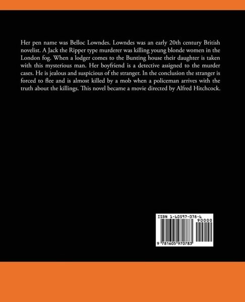 Her pen name was Belloc Lowndes. Lowndes was an early 20th century British novelist. A Jack the Ripper type murderer was killing young blonde women in the London fog. When a lodger comes to the Bunting house their daughter is taken with this mysterious man. Her boyfriend is a detective assigned to the murder cases. He is jealous and suspicious of the stranger. In the conclusion the stranger is forced to flee and is almost killed by a mob when a policeman arrives with the truth about the killings. This novel became a movie directed by Alfred Hitchcock.