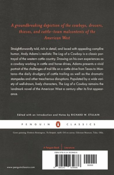 Straightforwardly told, rich in detail, and laced with appealing campfire humor, Andy Adams's realistic The Log of a Cowboy is a classic portrayal of the western cattle country. Drawing on his own experiences as a cowboy working in cattle and horse drives, Adams presents a vivid portrait of the challenges of trail life on a cattle drive from Texas to Montana-the daily drudgery of cattle trailing, as well as the dramatic stampedes and other treacherous disruptions. Populated by a wide variety of well-drawn, lively characters, The Log of a Cowboy remains the landmark novel of the American West a century after its first appearance. This is the first edition of this work published as a Penguin Classic. For more than seventy years, Penguin has been the leading publisher of classic literature in the English-speaking world. With more than 1,700 titles, Penguin Classics represents a global bookshelf of the best works throughout history and across genres and disciplines. Readers trust the series to provide authoritative texts enhanced by introductions and notes by distinguished scholars and contemporary authors, as well as up-to-date translations by award-winning translators.