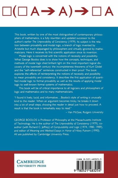 This book written by one of the most distinguished of contemporary philosophers of mathematics, is a fully rewritten and updated successor to the author's earlier The Unprovability of Consistency (1979). Its subject is the relation between provability and modal logic, a branch of logic invented by Aristotle but much disparaged by philosophers and virtually ignored by mathematicians. Here it receives its first scientific application since its invention.