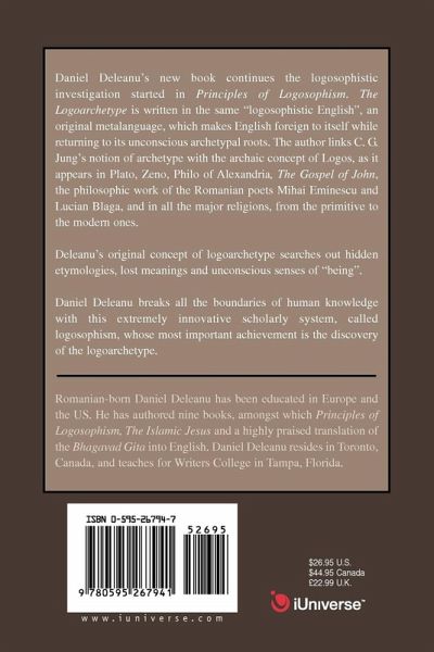 Daniel Deleanu's new book continues the logosophistic investigation started in "Principles of Logosophism"."The Logoarchetype" is written in the same "logosophistic English",an original metalanguage,which makes English foreign to itself while returning to its unconscious archetypal roots.The author links C.G.Jung's notion of archetype with the archaic concept of Logos,as it appears in Plato,Zeno,Philo of Alexandria,the Gospel of John,the philosophic work of the Romanian poets Mihai Eminescu and Lucian Blaga,and in all the major religions,from the primitive to the modern ones. Deleanu's original concept of logoarchetype searches out hidden etymologies,lost meanings and unconscious senses of "being". Daniel Deleanu breaks all the boundaries of human knowledge with this extremely innovative scholarly system,called logosophism,whose most important achievement is the discovery of the logoarchetype.