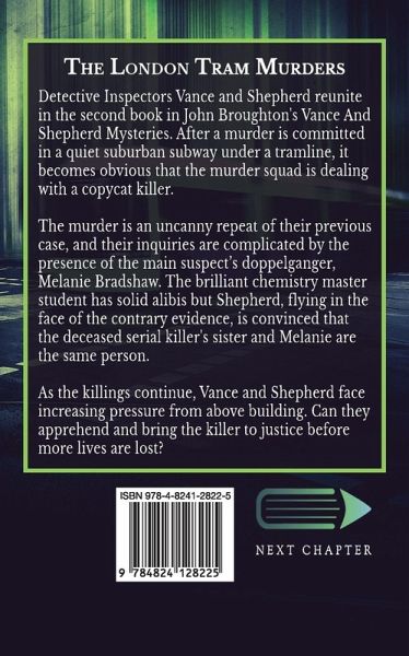 Detective Inspectors Vance and Shepherd reunite in the second book in John Broughton's Vance And Shepherd Mysteries. After a murder is committed in a quiet suburban subway under a tramline, it becomes obvious that the murder squad is dealing with a copycat killer. The murder is an uncanny repeat of their previous case, and their inquiries are complicated by the presence of the main suspect's doppelganger, Melanie Bradshaw. The brilliant chemistry master student has solid alibis but Shepherd, flying in the face of the contrary evidence, is convinced that the deceased serial killer's sister and Melanie are the same person. As the killings continue, Vance and Shepherd face increasing pressure from above building. Can they apprehend and bring the killer to justice before more lives are lost?