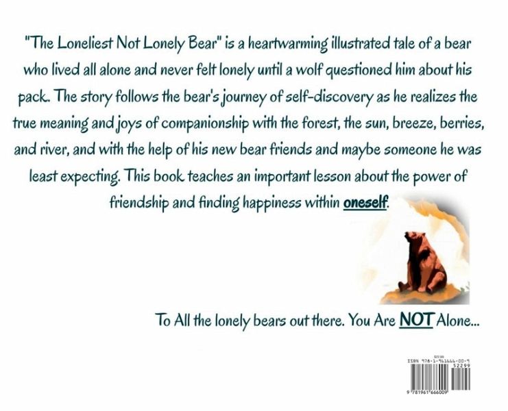 "The Loneliest Not Lonely Bear" is a heartwarming illustrated tale of a bear who lived all alone and never felt lonely until a wolf questioned him about his pack. The story follows the bear's journey of self-discovery as he realizes the true meaning and joys of companionship with the forest, the sun, breeze, berries, and river, and with the help of his new bear friends and maybe someone he was least expecting. This book teaches an important lesson about the power of friendship and finding happiness within oneself.