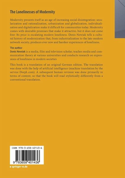 Modernity presents itself as an age of increasing social disintegration: secularization and rationalization, urbanization and globalization, individualization and digitalization make it difficult for communities today. Modernity comes with desirable promises that make it attractive, but it does not come free: Its price is escalating modern loneliness. Denis Newiak tells a cultural history of modernization that, from industrialization to the late-modern network society, produces ever new and harsher experiences of loneliness.