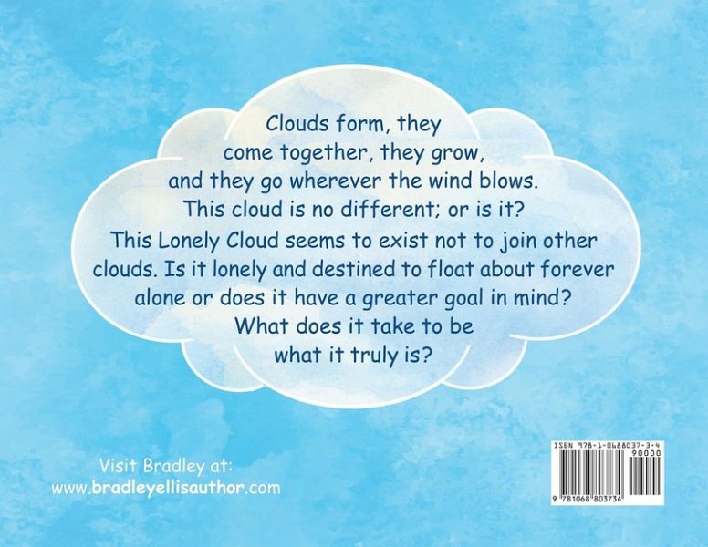 Clouds form, they grow, the rain comes and the cycle starts all over. But one little cloud travels the world seeing wonderful things all by itself. Each time it runs into a larger cloud, the larger cloud comments on how lonely the little cloud must be by itself and that it should join the larger cloud and stay. But is that really what is best for this little cloud? Does it stay with a group, change, and get friends or does it stay true to itself and refuse to change just to be "part of the group"? Children are constantly being faced with this exact challenge daily. Is it better to have friends but lose yourself or stay who you are and live life on your own terms? A fiction book where the cloud's life is a metaphor for realizing the benefit of being yourself and the happiness and freedom being who you are regardless of what other people think can bring.