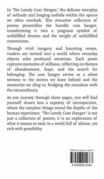 In "The Lonely Coat Hanger," the delicate interplay of solitude and longing unfolds within the spaces we often overlook. This evocative collection of poems personifies the humble coat hanger, transforming it into a poignant symbol of unfulfilled dreams and the weight of unfulfilled connections. Through vivid imagery and haunting verses, readers are invited into a world where everyday objects echo profound emotions. Each poem captures moments of stillness, reflecting on themes of abandonment, hope, and the search for belonging. The coat hanger serves as a silent witness to the stories we leave behind and the memories we cling to, bridging the mundane with the extraordinary. As you journey through these pages, you will find yourself drawn into a tapestry of introspection, where the simplest things reveal the depths of the human experience. "The Lonely Coat Hanger" is not just a collection of poems; it is an exploration of what it means to exist in a world full of silence, yet rich with possibility.
