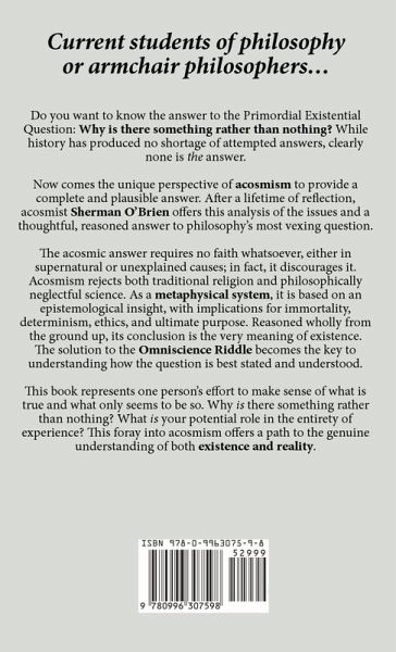 Current students of philosophy or armchair philosophers... Want the answer to the Primordial Existential Question: Why is there something rather than nothing? While history has produced no shortage of attempted answers, clearly none is the answer. Now comes the unique perspective of acosmism to provide a complete and plausible answer. After a lifetime of reflection, acosmist Sherman O'Brien offers this analysis of the issues and a thoughtful, reasoned answer to philosophy's most vexing question. The acosmic answer requires no faith whatsoever, either in supernatural or unexplained causes; in fact, it discourages it. Acosmism rejects both traditional religion and philosophically neglectful science. As a metaphysical system, it is based on an epistemological insight, with implications for immortality, determinism, ethics, and ultimate purpose. Reasoned wholly from the ground up, its conclusion is the very meaning of existence. The solution to the Omniscience Riddle becomes the key to understanding how the question is best stated and understood. This book represents one person's effort to make sense of what is true and what only seems to be so. Why is there something rather than nothing? What is your potential role in the entirety of experience? This foray into acosmism offers a path to the genuine understanding of both existence and reality. Note: the main text constitutes roughly two-thirds of the total pages, the remainder being mostly endnotes.
