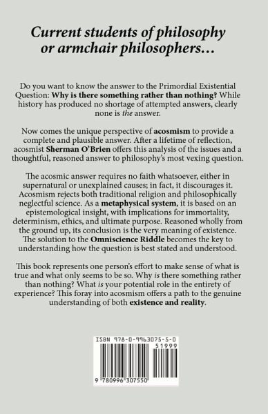 Current students of philosophy or armchair philosophers... Want the answer to the Primordial Existential Question: Why is there something rather than nothing? While history has produced no shortage of attempted answers, clearly none is the answer. Now comes the unique perspective of acosmism to provide a complete and plausible answer. After a lifetime of reflection, acosmist Sherman O'Brien offers this analysis of the issues and a thoughtful, reasoned answer to philosophy's most vexing question. The acosmic answer requires no faith whatsoever, either in supernatural or unexplained causes; in fact, it discourages it. Acosmism rejects both traditional religion and philosophically neglectful science. As a metaphysical system, it is based on an epistemological insight, with implications for immortality, determinism, ethics, and ultimate purpose. Reasoned wholly from the ground up, its conclusion is the very meaning of existence. The solution to the Omniscience Riddle becomes the key to understanding how the question is best stated and understood. This book represents one person's effort to make sense of what is true and what only seems to be so. Why is there something rather than nothing? What is your potential role in the entirety of experience? This foray into acosmism offers a path to the genuine understanding of both existence and reality. Note: the main text constitutes roughly two-thirds of the total pages, the remainder being mostly endnotes.